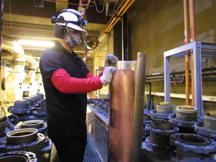 万利将废弃物转化成有效的工业或民生原物料,,,,图为废铜液淬炼后再制成纯度极高的铜管