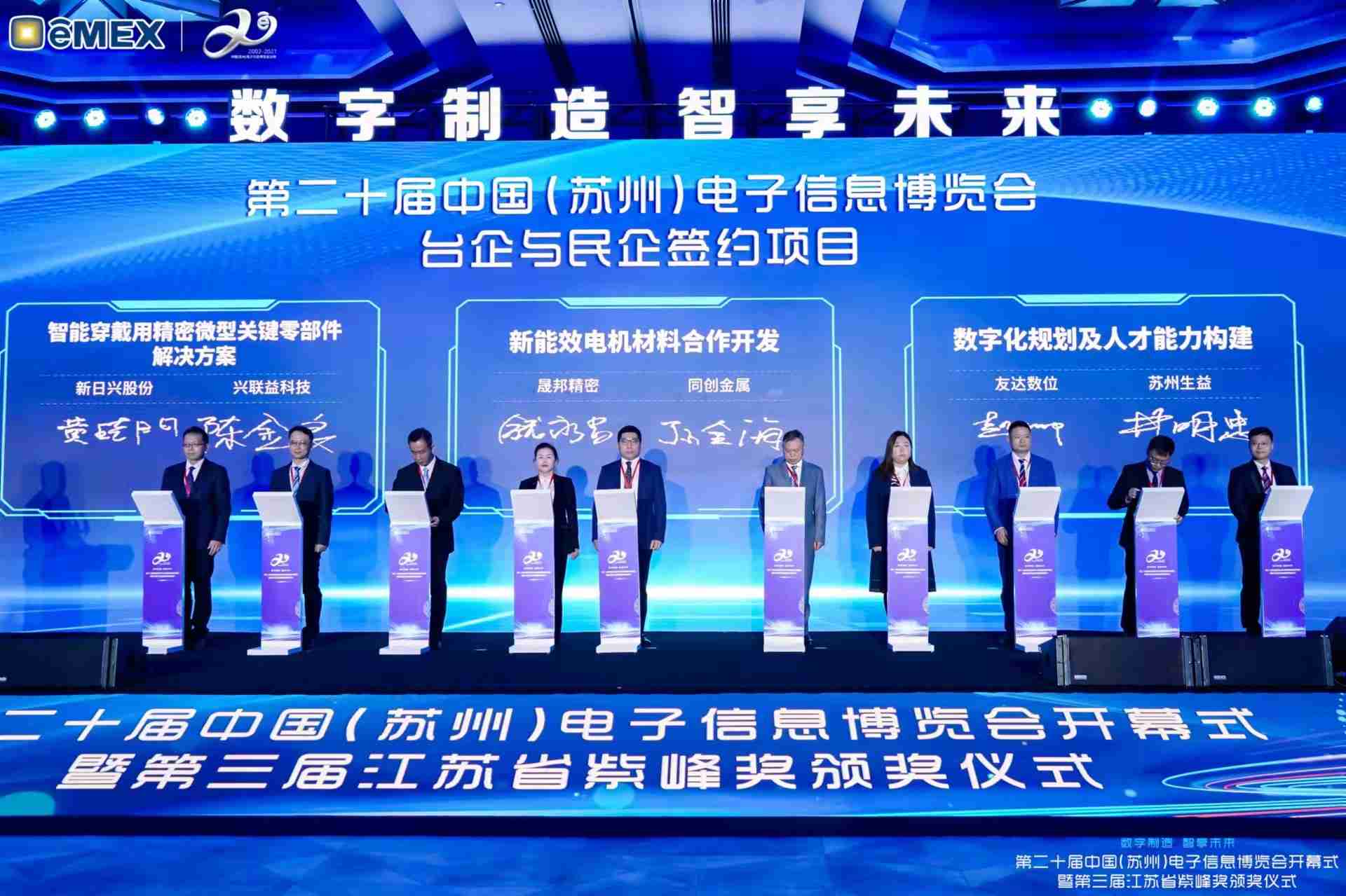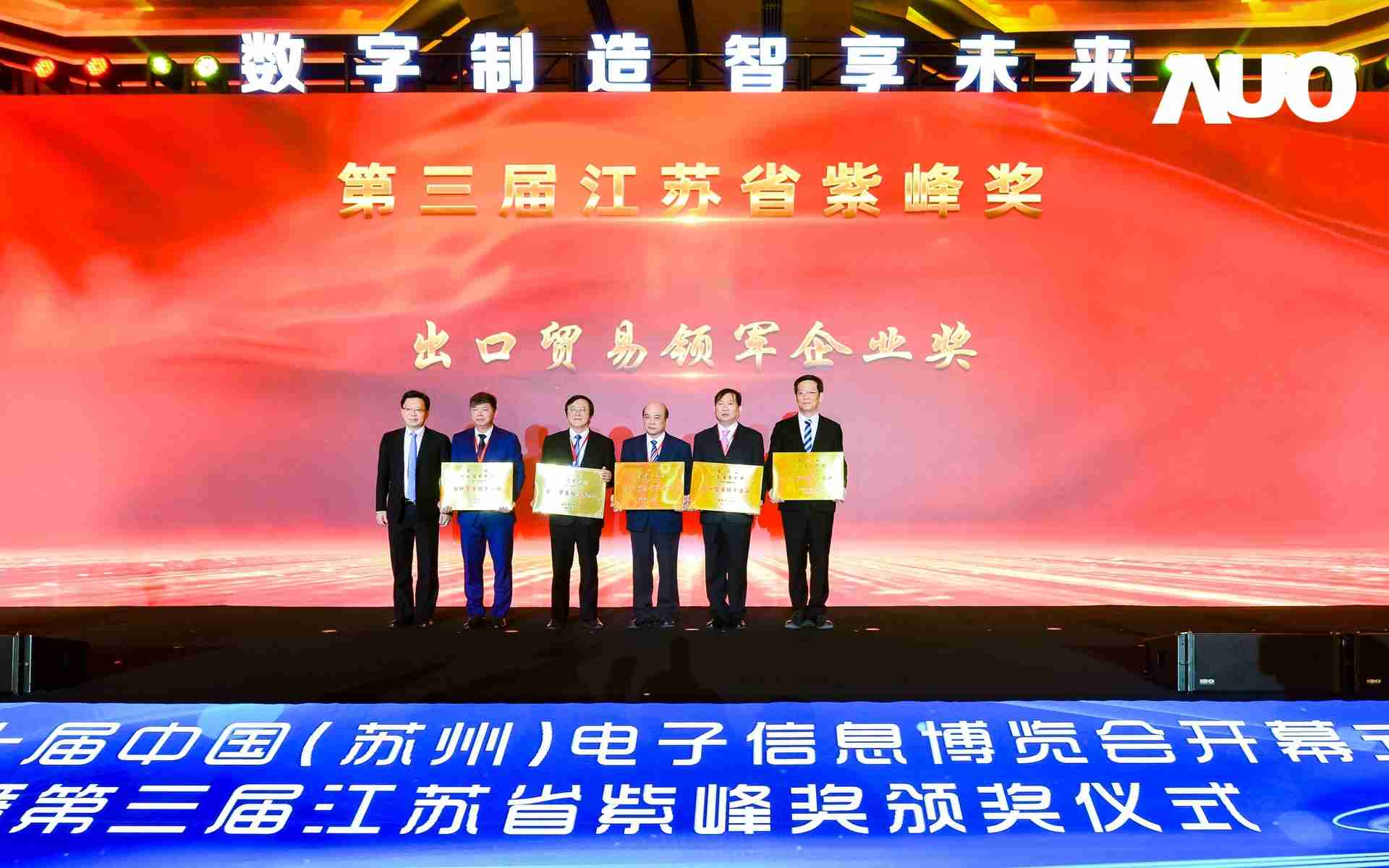 电博会开幕式当天也是第三届江苏省紫峰奖颁奖仪式,,省台办、、工信厅、、、、商务厅、、、苏州市相关领导均出席并颁奖。。。。该奖项为表彰对江苏高质量发展做出积极贡献的在苏企业,,由江苏省政府专门设立。。万利光电 (苏州) 总经理郭振明代表上台领奖,,,,这也是万利苏州连续三次蝉联紫峰奖 出口贸易领军企业奖。。。。万利数位总经理赵丽娜女士,,,也参与本次开幕式,,,上台为本地化赋能签署战略合作协议,,,,将优质服务资源集合、、、、下沉到更多细分行业,,,为更多地区的制造企业提供数字化转型服务。。。
