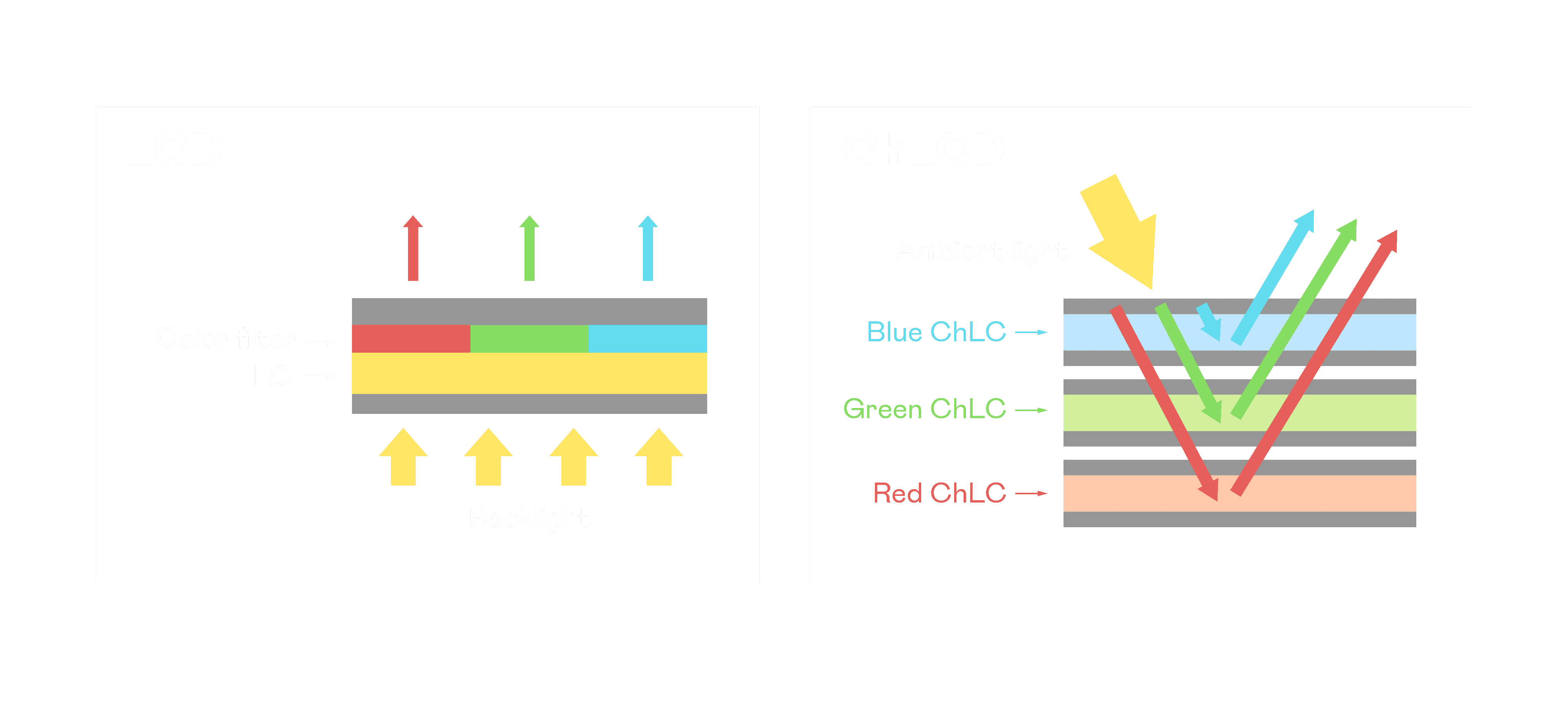 ChLCD 胆固醇液晶就如同纸张一样,,透过反射环境光来显示影像,,,,因此长时间观看不易造成人眼视觉疲劳,,,可达到护眼效果。。。。当处于户外阳光下使用,,,,LCD 影像容易失真而不易观看,,,但胆固醇液晶仍可维持较佳的影像品质。。。。